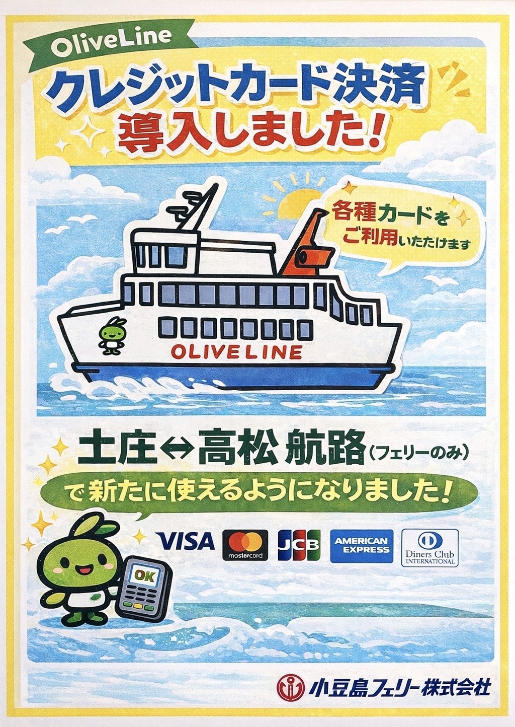 いつも小豆島フェリーをご利用いただき誠にありがとうございます。 この度、高松~小豆島(土庄)間のフェリーにおいて、クレジットカードでのお支払いが可能になりました! 2026年3月9日(月)より、各種クレジットカードをご利用いただけます。 これまでの現金でのお支払いに加え、より便利にご利用いただけます。 なお、高松~小豆島(土庄)間の高速艇につきましては、これまで通り現金でのお支払いのみとなっておりますので、あらかじめご了承ください。 是非、皆さまのご利用を心よりお待ちしております!!